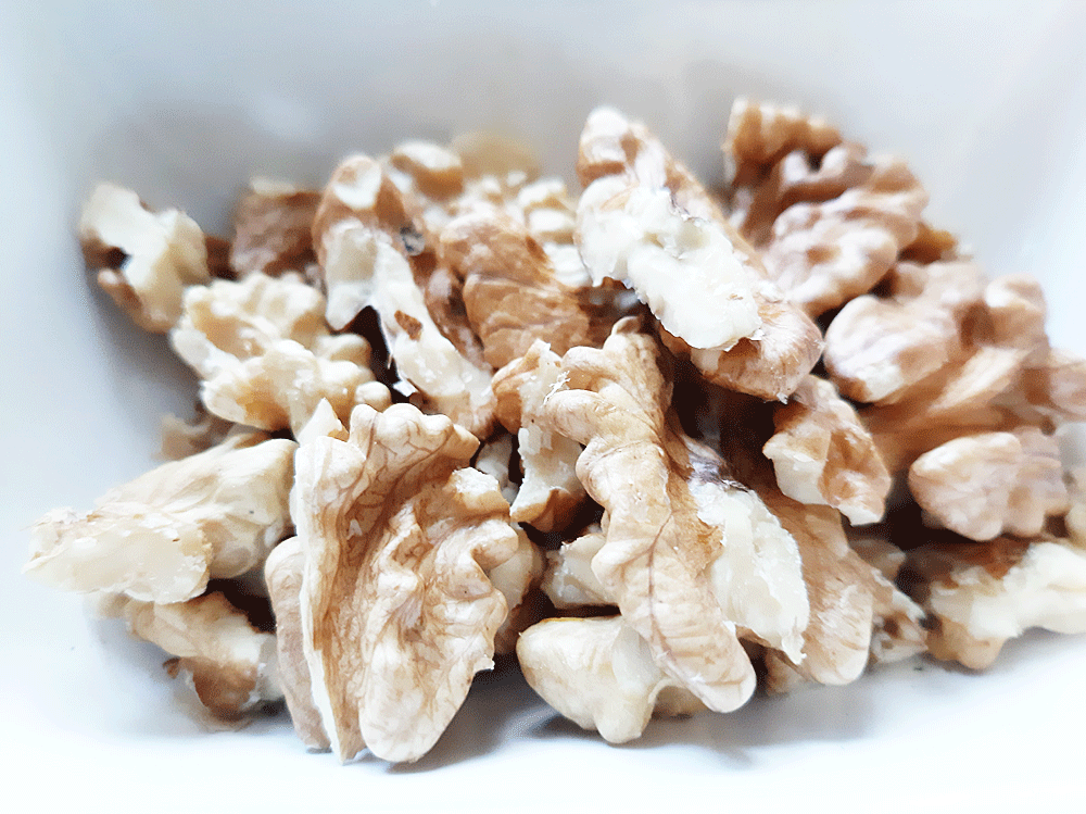 Avec la pointe d’un couteau de cuisine, j’ouvre les noix, je les rince sous un filet d’eau (pour éviter l’apparition d’aphtes), les essuie avec du sopalin avant de les broyer au mixer.