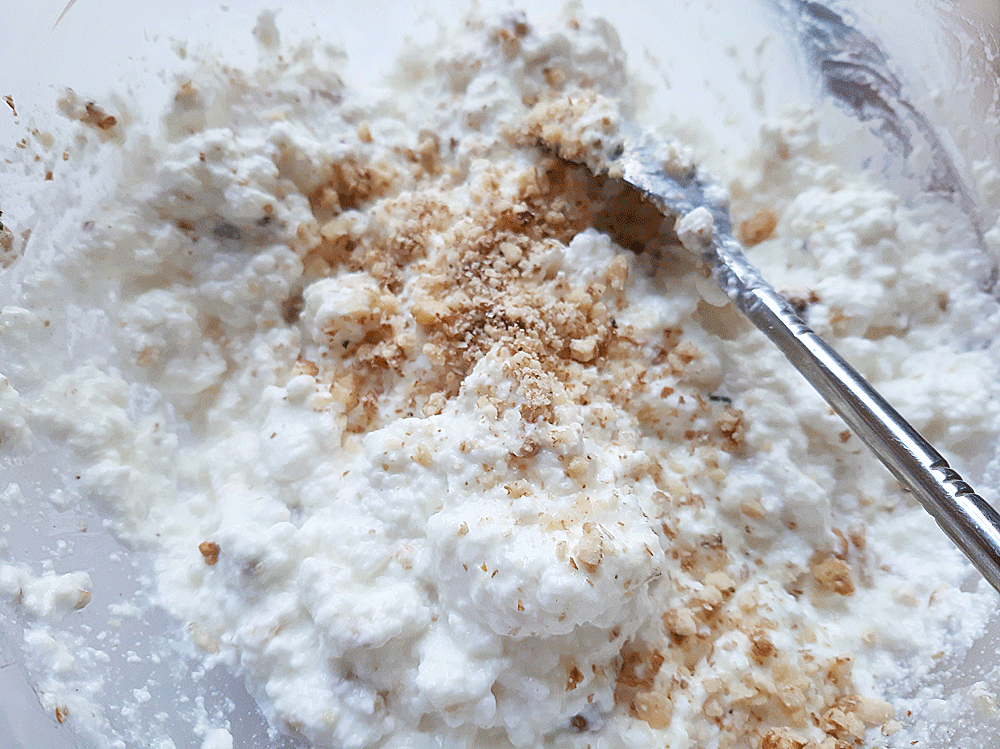 Je mélange le fromage de chèvre frais avec les noix. A la cuillère à soupe, je prélève des portions de ce mélange les place dans une assiette ou un plat de service.