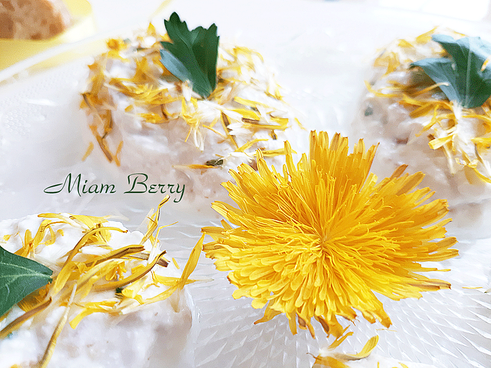 Tant que je croiserais les quelques fleurs de mon jardin, je les inviterais à table pour les partager avec vous ! Après vous avoir partagé une omelette aux violettes, s(‘il est une fleur qui sonne le printemps installé, c’est la fleur de pissenlit. Pour cette recette, j’utilise seulement ses pétales qui vont parsemer le fromage de chèvre frais.