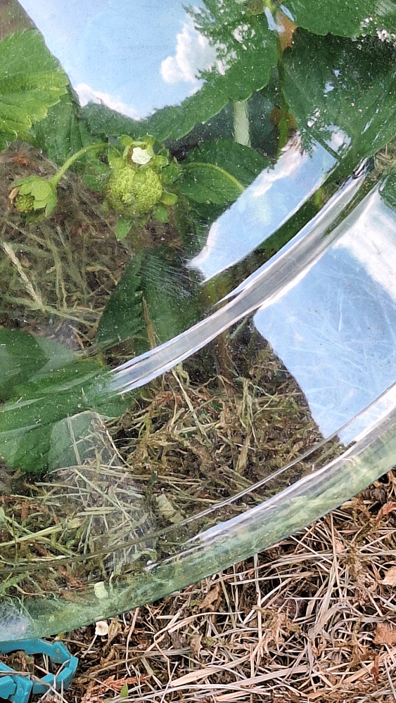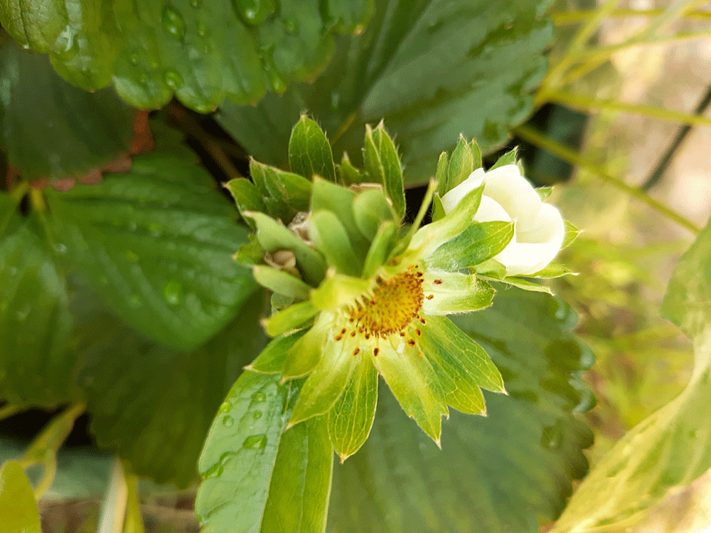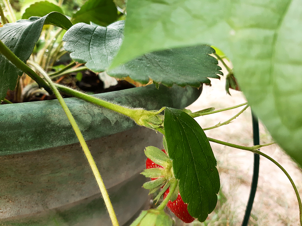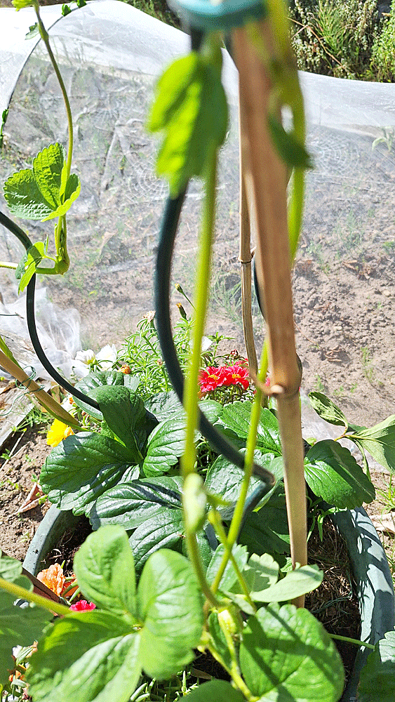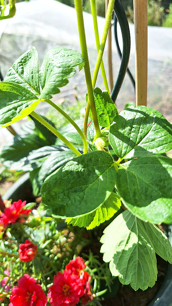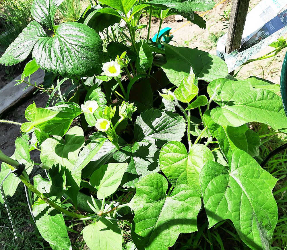 Les dernières gelées de printemps écartées, j’essaie sa culture parmi le pourpier annuel, espérant une pollinisation fruitière des abeilles qui y viendraient butiner. Les premiers fruits ont été à la mi-mai. Au tour du développement des feuilles et surtout des stolons que je guident sur les supports au fur et à mesure de leur croissance sur le pied mère : le grand pot ne contient qu’un plant.
