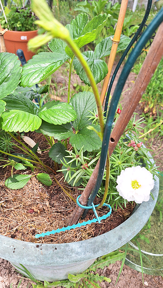 Le temps me dira si j’eus bien fait de le déterrer de l’emplacement qui était le sien jusqu’au début du printemps 2022. Jusqu’à présent, il a plus ou moins végété, ne semblant pas faire preuve de grand enthousiasme à s’élancer au sommet, si je puis le, dire ainsi ! Car s’agissant d’un fraisier grimpant dont la mission est de prendre de la hauteur, peut-être est-ce un fraisier dont la singularité requiert bien plus de temps de croissance au regard des autres que je vais appeler « normaux ». Si vous le connaissez, n’hésitez pas à échanger quelques mots ;)