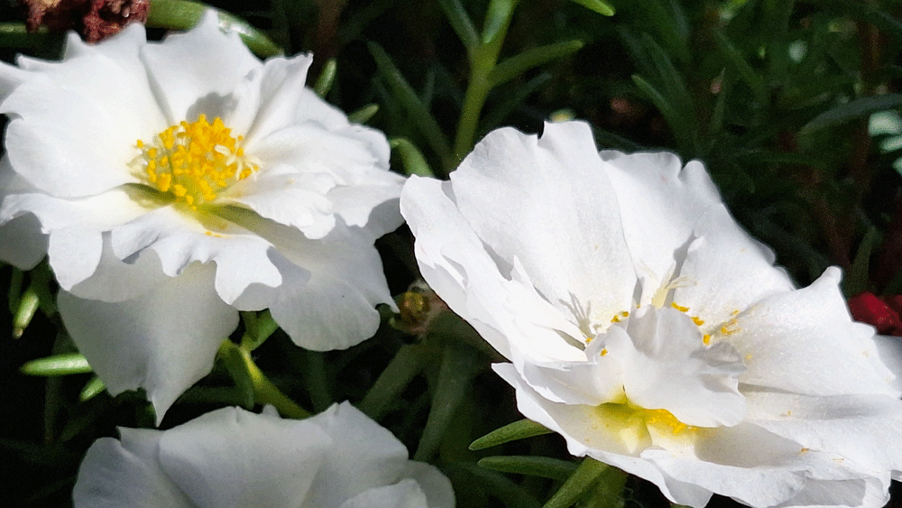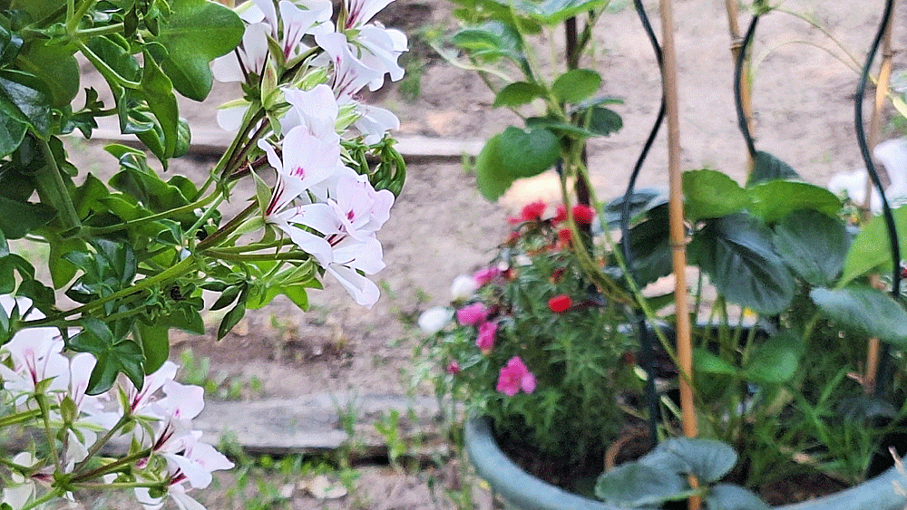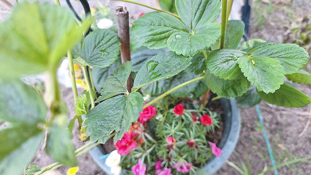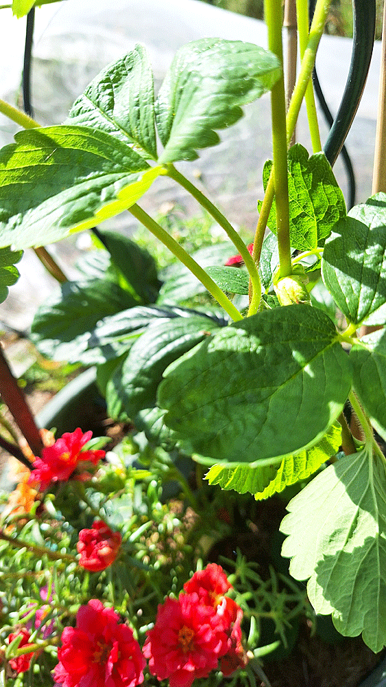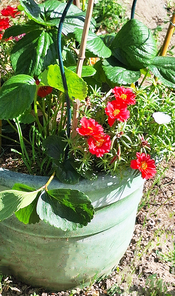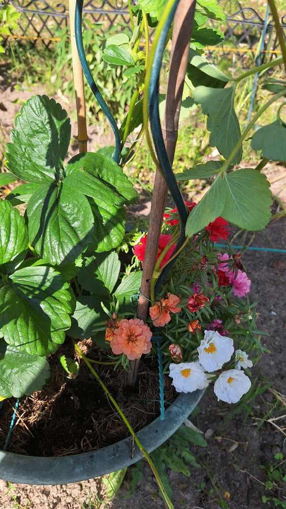 Entre fraisier central, ipommées et pourpier semé autour