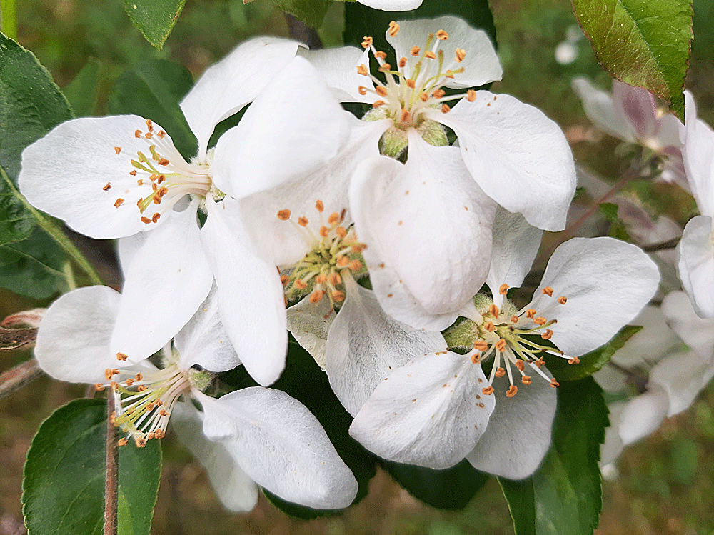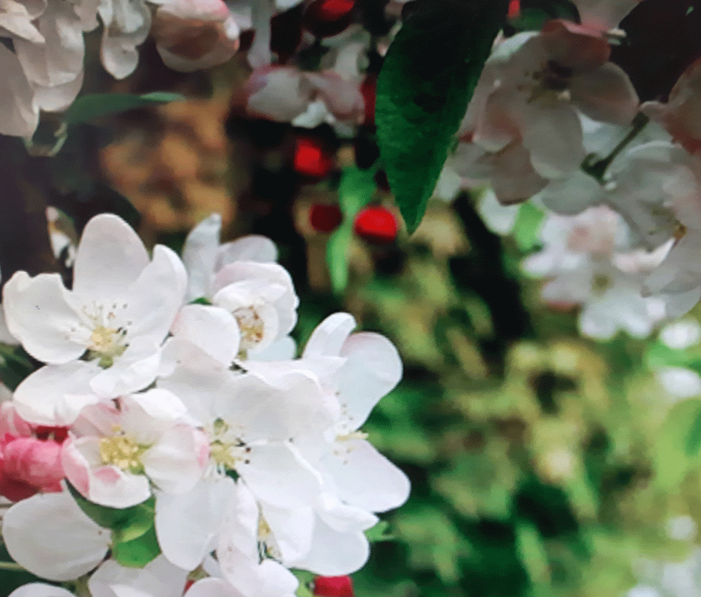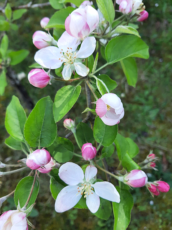 J’aime contempler cette myriade florale au fil des matins clairs du jardin, à mi-chemin entre fleurs non encore épanouies, et le doux visuel veiné de rose, puis atteindre la blancheur d’une pleine maturité, au gré du temps. Il a quelques années à présent, il s’est étoffé lentement ses trois premières années. J’en vois qui s’affèrent autour, les abeilles, elles aussi semblent son ravies de se trouver en séjour sur les fleurs du pommier.