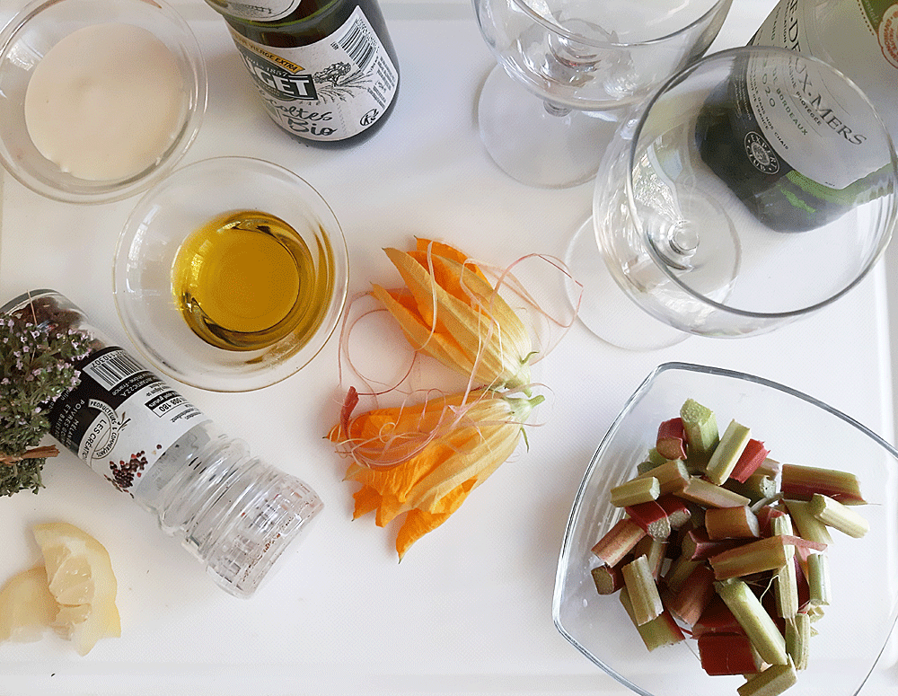 Envie de fraîcheur par cette montée des températures sur le retour ? L’acidulé de la chair du fruit de la passion, composant avec l’acidité de la rhubarbe un brin salée en compotée, pour sublimer deux filets frais à chair fine, que j’ai fait préparer par le poissonnier. Et si vous n’avez pas de rhubarbe, le fruit de la passion que l’on trouve facilement fera très bien aussi. Les fleurs de courgettes sont bien sûr facultatives. En revanche, deux courgettes râpées et cuites à la poêle sur un filet d’huile d’olive, juste croquantes, pour accompagner le poisson.