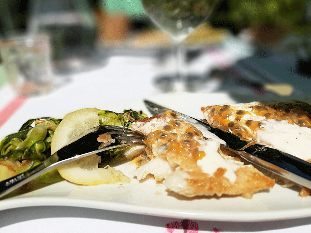 6. Terminer en versant la crème sur le poisson, puis la chair d’une moitié de fruit de la passion. Recommencer pour la seconde assiette et servez aussitôt. Bon appétit ![]()