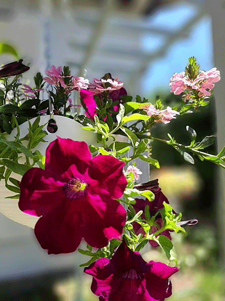 Surfinias suspendus hydratés : pour arroser sans m’éclabousser, quelques glaçons déposés sur le terreau l’humidifient toute la journée.