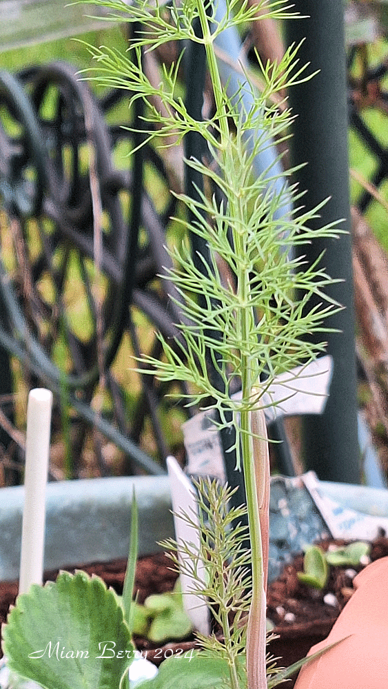 Le fenouil pourpre croît autour de hautes cannes après quelque années de plantation, peut atteindre jusqu’à 1,60 m en hauteur et 0,80 m en largeur. Après l’avoir rabattue de quelques centimètres avant les grands coups de chauffe, elle a redémarrée, et la voici qui s’organise autour d’un petit fouillis potager.
