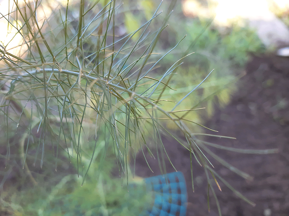 A ne pas confondre avec le fenouil bulbe, dit le fenouil de Florence. Toutes les parties de la plante ci-dessus, de feuillage aérien, s’utilisent pour leur saveur anisée. J’en mets dans les salades ou bien, comme garniture. Sa base se cuit tel un légume, peut être mangée crue et si on sèche les tiges, cela fait de bonnes brochettes pour poisson et crustacés l’été. La même préparation peut bien sûr se faire avec les tiges fraîches, au même titre que l’aneth.