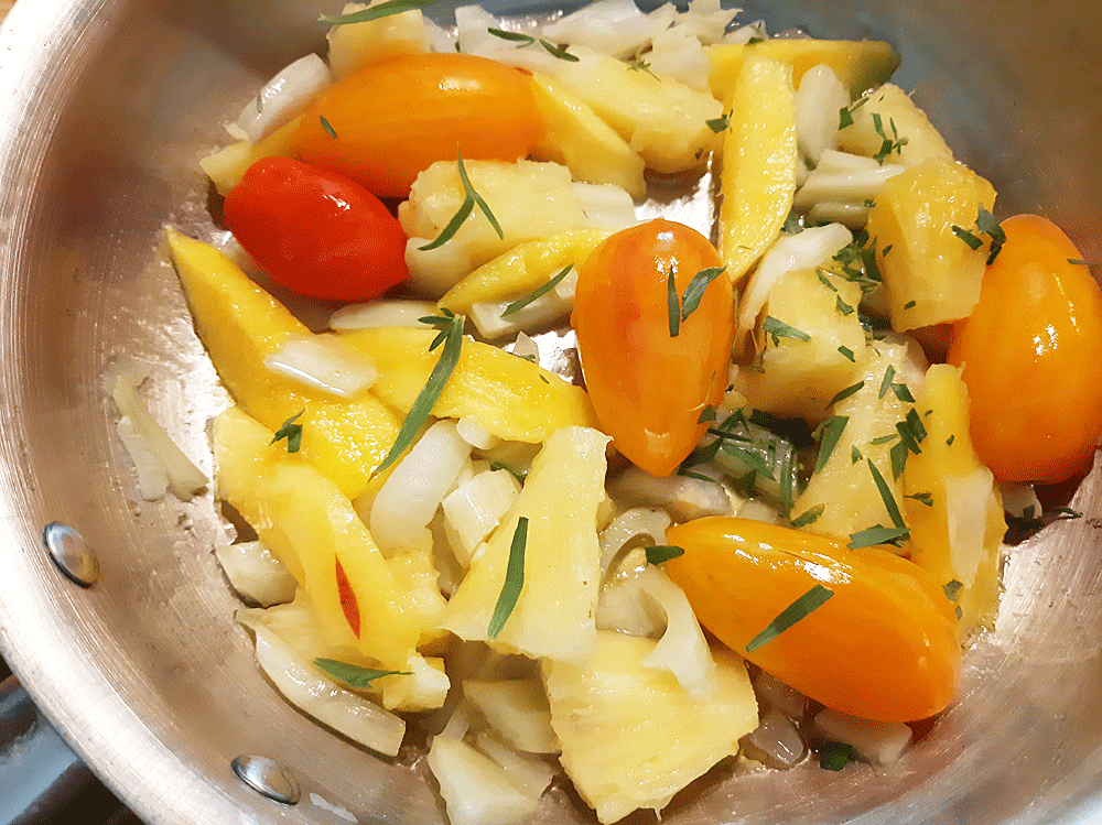 Dans une large poêle, badigeonner le fond d’huile d’olive. Lorsque celle-ci commence à chauffer, ajouter tous les ingrédients ci-dessus, avec les dés d’ananas. À la cuillère en bois, mélanger jusqu’à ce que le tout devienne légèrement doré. Terminer par des pluches d’estragon et remuer à nouveau.
