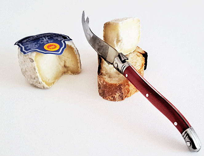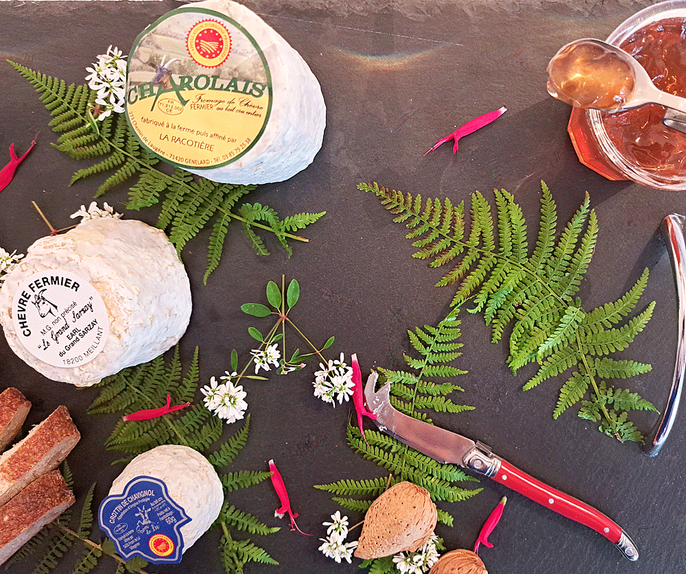 Faisant suite aux achats qui pour sûr allaient régaler les amis, j’organisais une matinée de dégustation fromages. Mon choix n’est pas anodin : sur le plateau, une sélection de fromages fermiers : l’immanquable Crottin de Chavignol, le Pouligny-St-Pierre, le Grand Sarzais, ainsi qu’une belle découverte, le Grand Charollais issu du terroir localisé entre Charolles et Montceau-les-Mines.