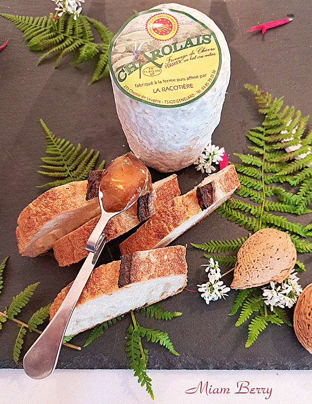 Le Charolais est obtenu à parti du lait caillé, de type lactique. Un fromage ensuite moulé puis égoutté pendant 48 h et c’est ensuite au sel sec qu’il est salé, cela après sa phase de ressuyage. Et, affiné sur claie, en cave pour environ une quinzaine de jours, une période pendant laquelle il va être retourné à deux reprises. Amateurs que nous sommes, on s’est dit que nous avons bien fait de le déguster avec de la gelée de coing (d’abord parce que fruit de saison), mais aussi, du miel, du chocolat ou de la confiture font amis-amis avec le Charolais. Je vais mettre en ligne d’ici peu la recette de gelée de coing.