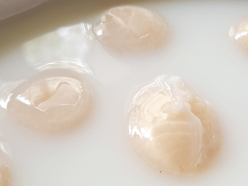 Décongeler les noix dans du lait : j’ajoute un peu d’eau. Cela à pour avantage de conserver une chaire tendre, qui na pas séchée sous décongélation. Une poignée de minutes suffit.