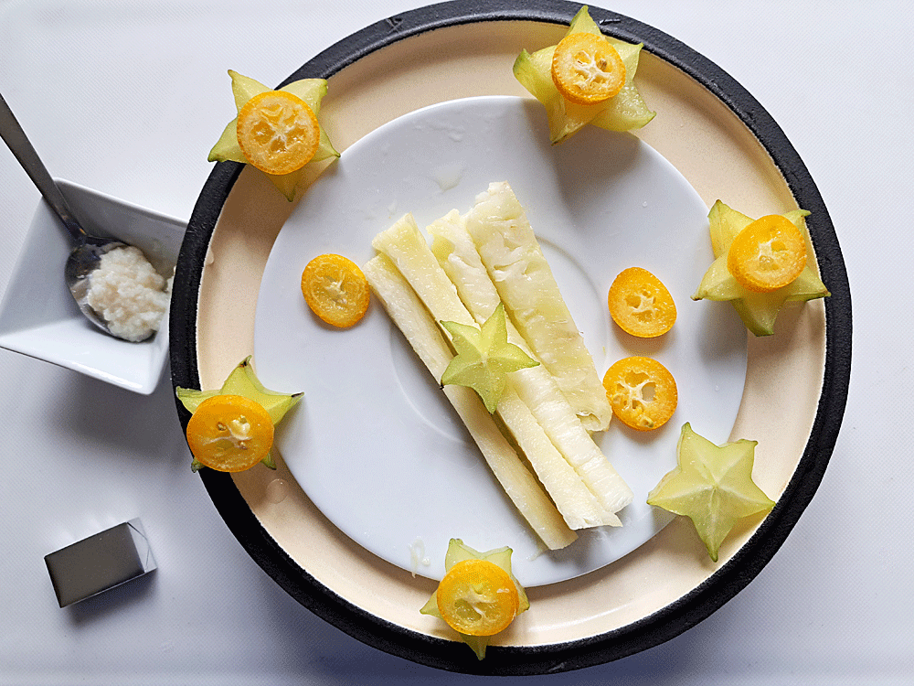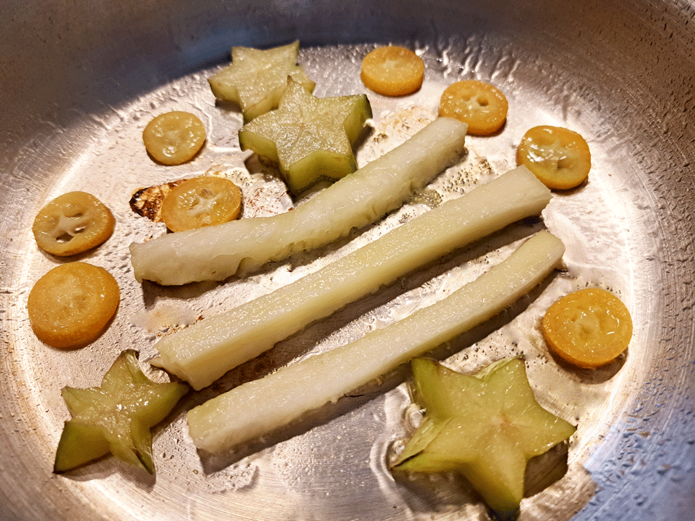 En fond d’assiette, déposer la sucrine réchauffée. Placer la caille dessus, saupoudrée de persil finement ciselé. Puis couler autour de la sucrine le jus de cuisson des cailles (préalablement filtré au chinois) et récupéré très chaud. Terminer en mettant fruits en sauce, tiges d’ananas et étoiles de carambole.
