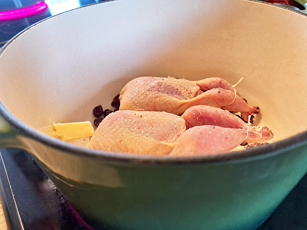 On passe à la cuisine et on se fait plaisir à faire plaisir. Pour ne pas perdre la chair délicate et moelleuse lors de la cuisson, j’ai cuit les cailles ainsi : d’abord en cocotte puis terminées rôties, la cocotte mise dans le four pour continuer la cuisson.