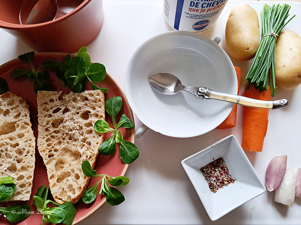 2 pommes de terre, 2 petits tronçons de carottes, 2 échalotes, 1 faisselle au lait cru de votre choix, quelques fines herbes à ciseler, sel, poivre du moulin, huile de noisette (facultative), un bon pain de campagne.