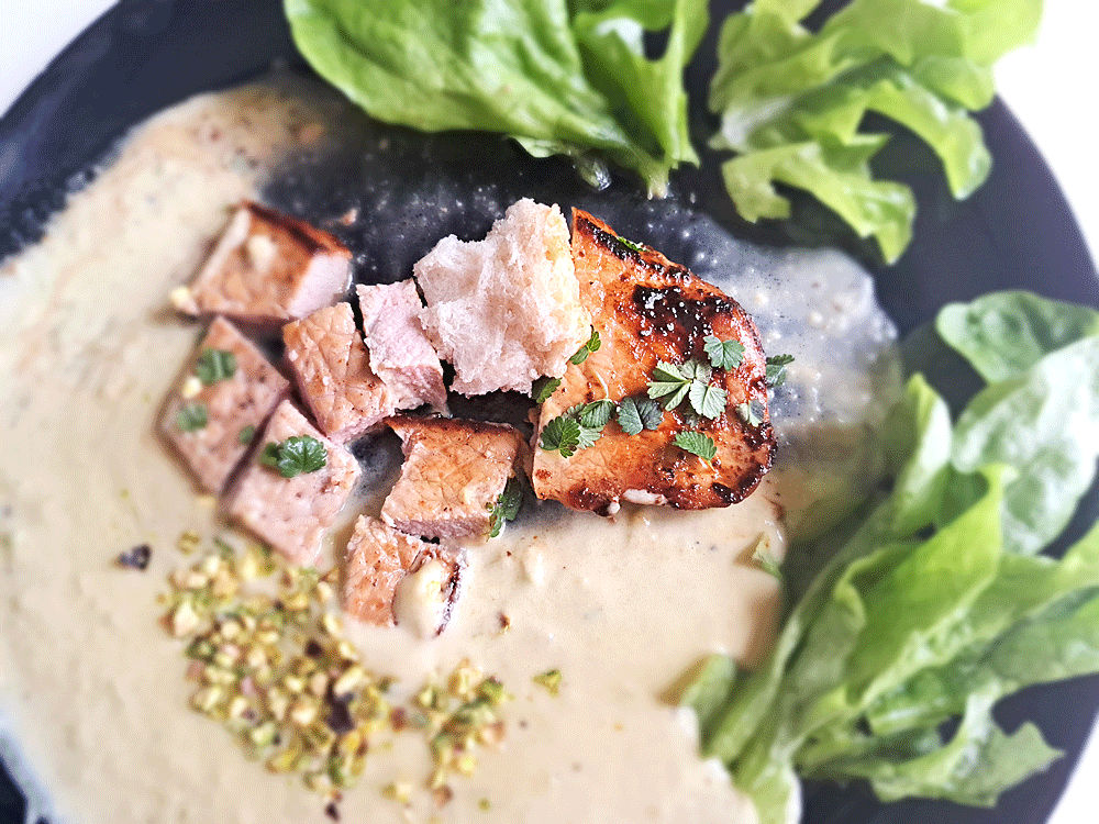 Disposez les escalopes – cuites à point – de chaque côté : dans 4 assiettes ou bien dans un plat de service. Nappez avec la sauce, puis parsemez de quelques pluche d’herbes fraîches aromatiques et de pistache broyée.