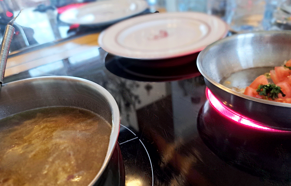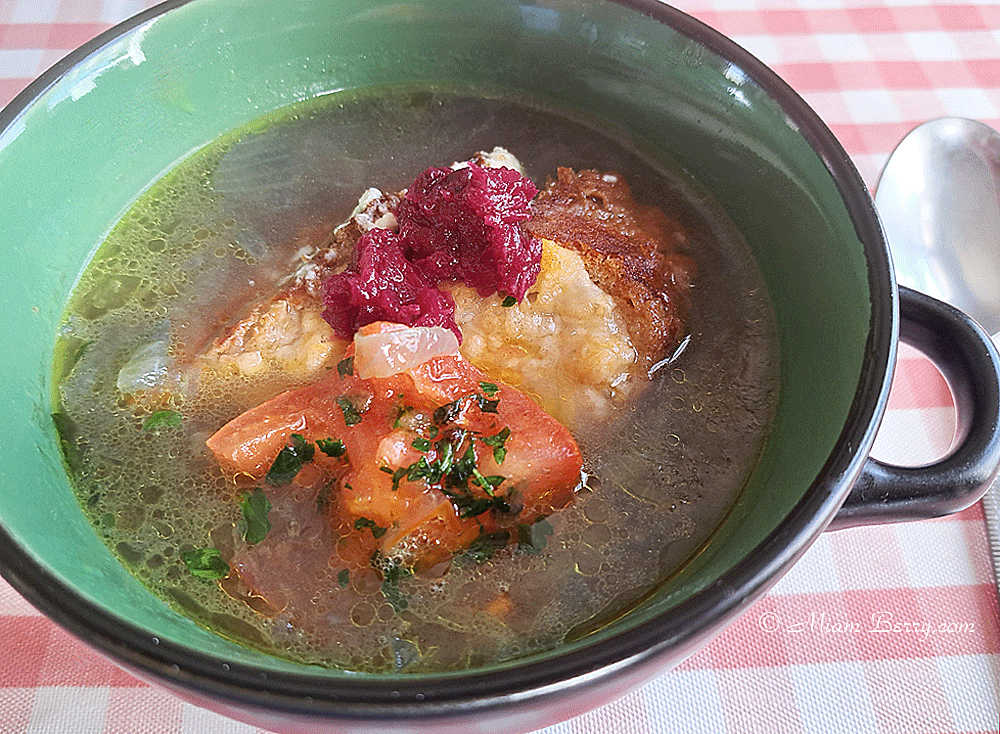Une base de bouillon de légumes associée à l’oignon violet de Galmi (un confit avec ce dernier), qui sera ajouté au moment de servir, sur une tranche de pain de campagne tartinée de gruyère de chèvre et passée quelques secondes sous le gril du four, avant d’être immergée du bon bouillon. Petite tomate persillée, puis rondelle de Crottin de Chavignol venue compléter le savoureux fumé.