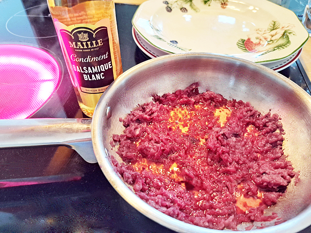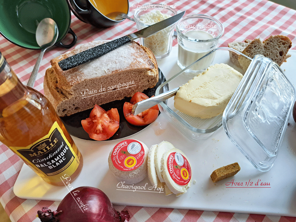 Voici donc ma recette toute simple, mais toutefois sublimée par l’arrivée du Crottin de Chavignol, d’une tartine au gruyère caprin t tout chaud, avec cette petite touche de rose délicatement coulée dessus.
