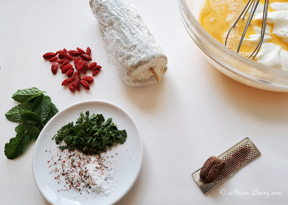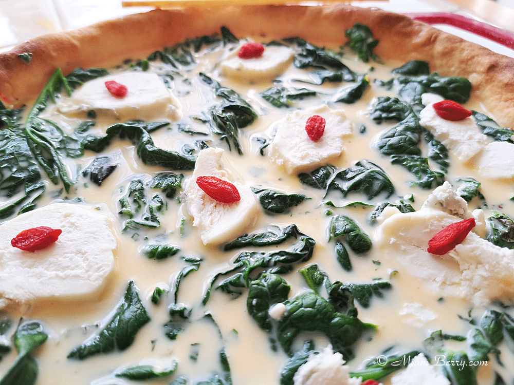 3. Ajoutez les épinards. Muscadez, salez et poivrez. Ciselez la menthe très finement et incorporez-la à la préparation. Bien mélanger l’ensemble. Versez sur le fond de tarte refroidi. Selon la dimension du moule, coupez 10 rondelles de fromage et répartissez-les sur la préparation. Si vous aimez, parsemez de baies de goji, séduisantes par la couleur vive, une saveur légèrement acidulée.