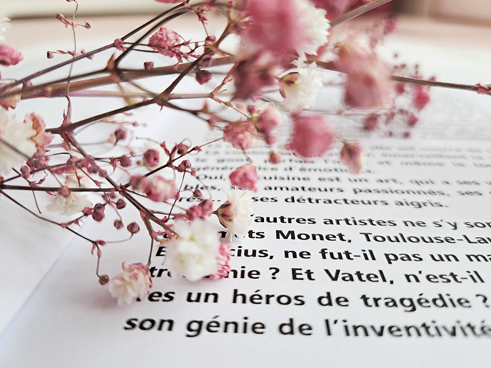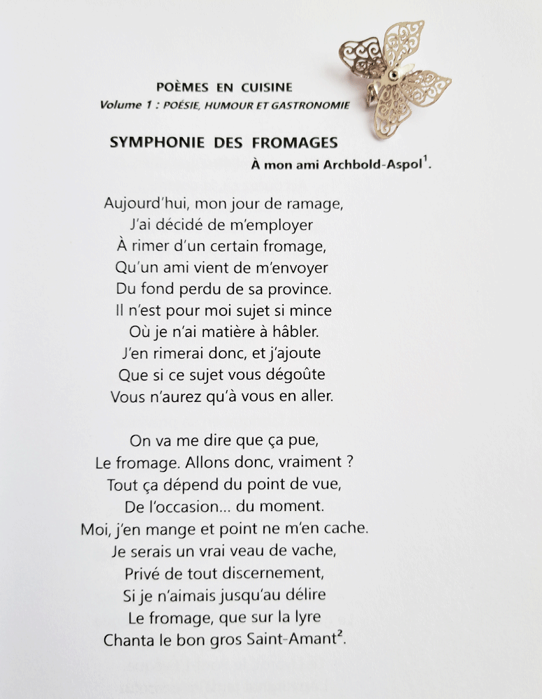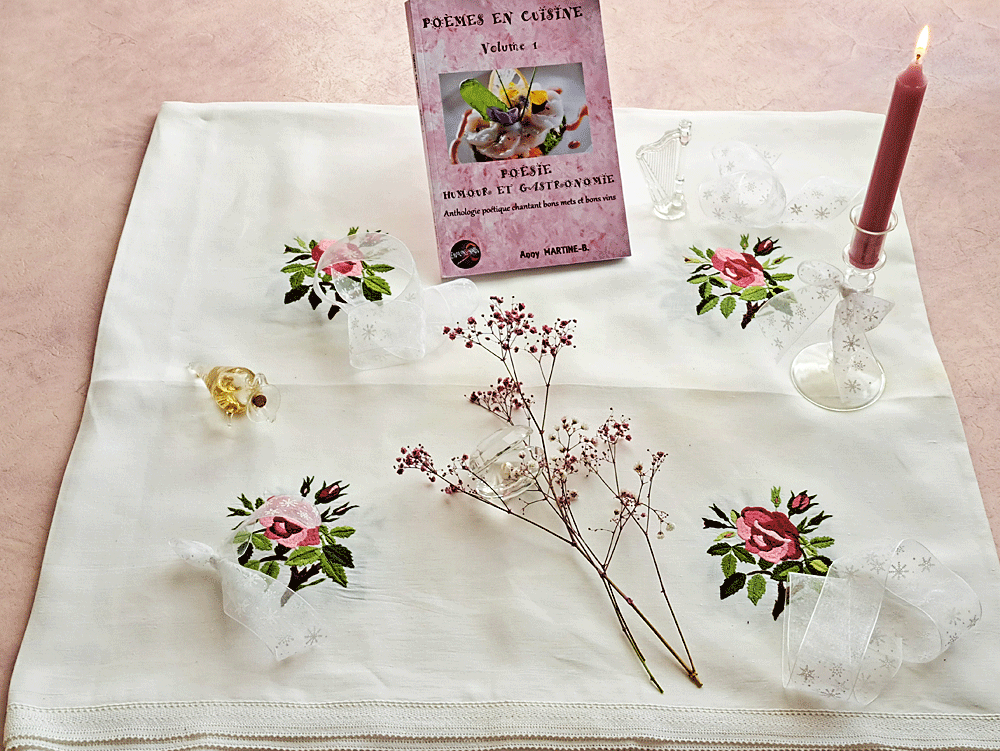 La langue française évolue à une vitesse folle et la poésie ne prend pas une ride. Ici, c’est une floraison de poèmes à citer lors d’un repas en bonne compagnie, consacrée aux plaisirs de la table et aux amitiés épicuriennes. L’ouvrage, qui célèbre la poésie jusqu’à votre table, est en fait une rare anthologie, enthousiaste et alléchante, écrite autour de la cuisine et du vin – par des cuisiniers, de grands auteurs : Ronsard, Boileau… – ainsi que par des chansonniers et de simples particuliers amoureux de leurs spécialités régionales. Cela m’a été offert l’an dernier, alors que je me trouvais à Clermont-Ferrand dans un salon de thé, avec des amis. Mais d’ouvrage poétique, l’avais-je oublié ? Perdu de vue ? Que nenni ! Juste occupée à rédiger d’autres articles jusqu’alors. Aussi, je tenais absolument à vous le présenter, après l’avoir aperçu de nouveau sur le rayonnage de ma transparente bibliothèque, au séjour.