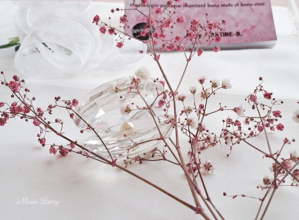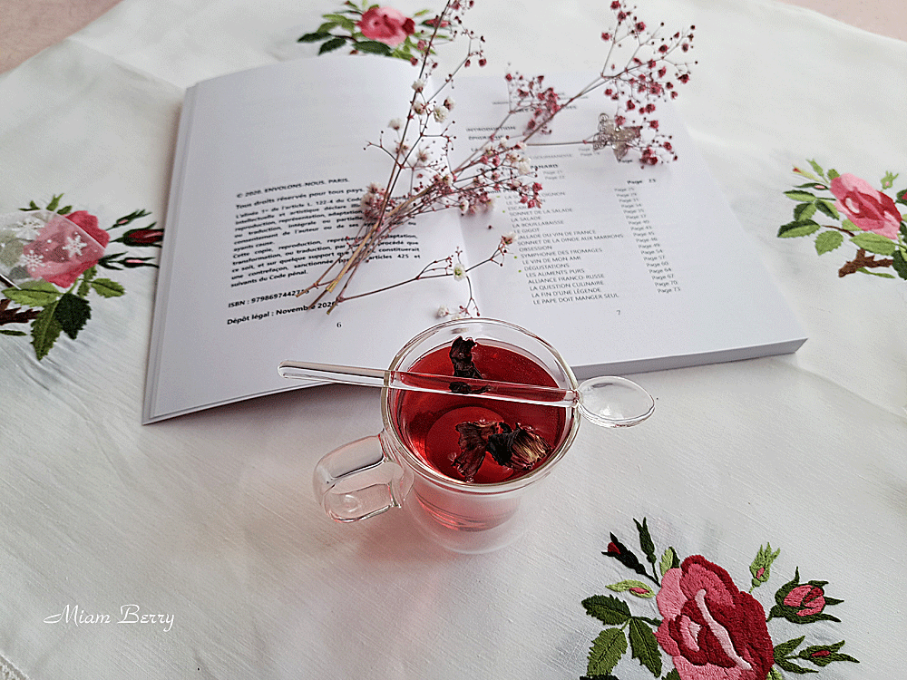 C’est avec plaisir que je le présente sur Miam Berry, entre roses brodées à la main (service 12 couverts), où quelques brins de gypsophile s’y glissent pour une petite scène choisie : un paillon qui offre sa compagnie au cristal, à une flamme printanière, à un thé d’hibiscus.