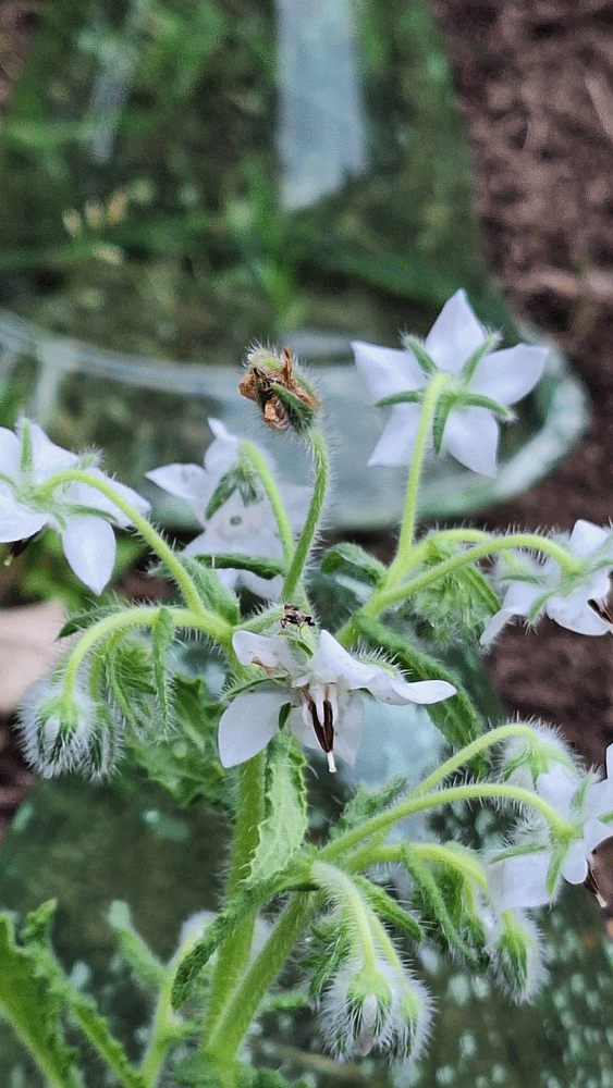 La bourrache boutonnée en ce moment, prête à éclore, d’autant plus avec les journées prochaines promises au Soleil. Je l’ai protégée car il fait toutefois vents et froidures le matin.