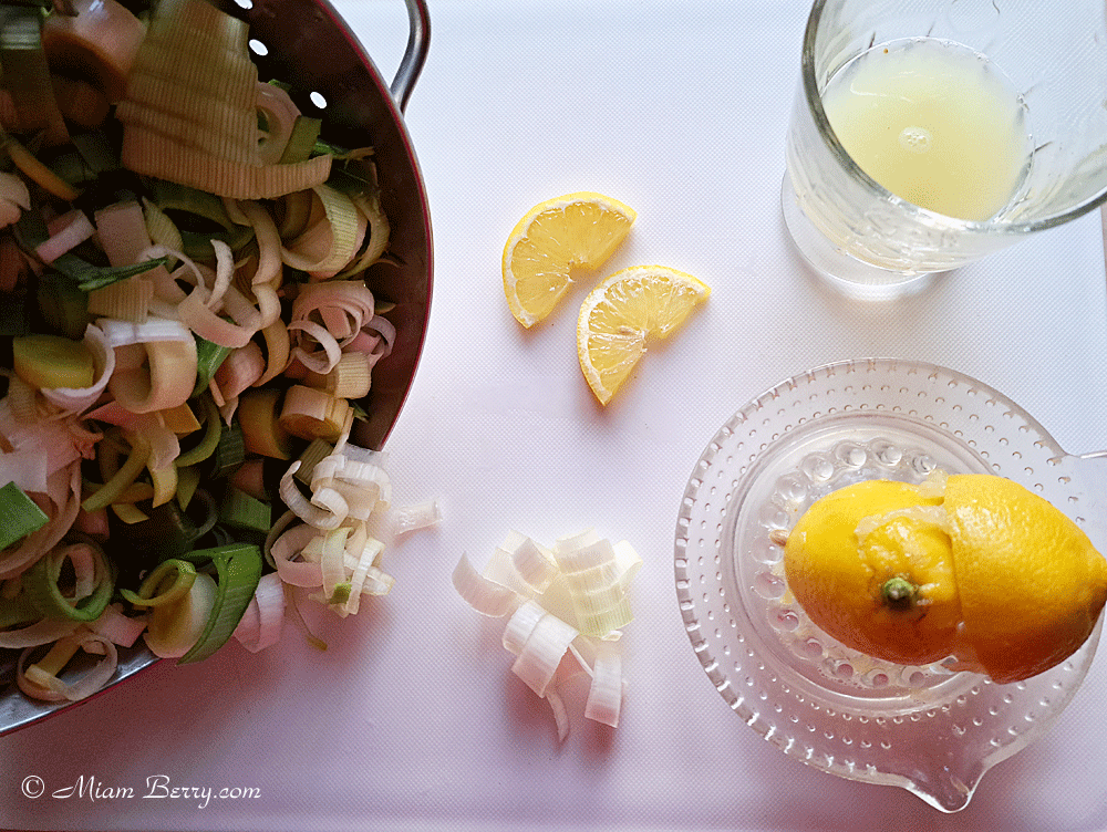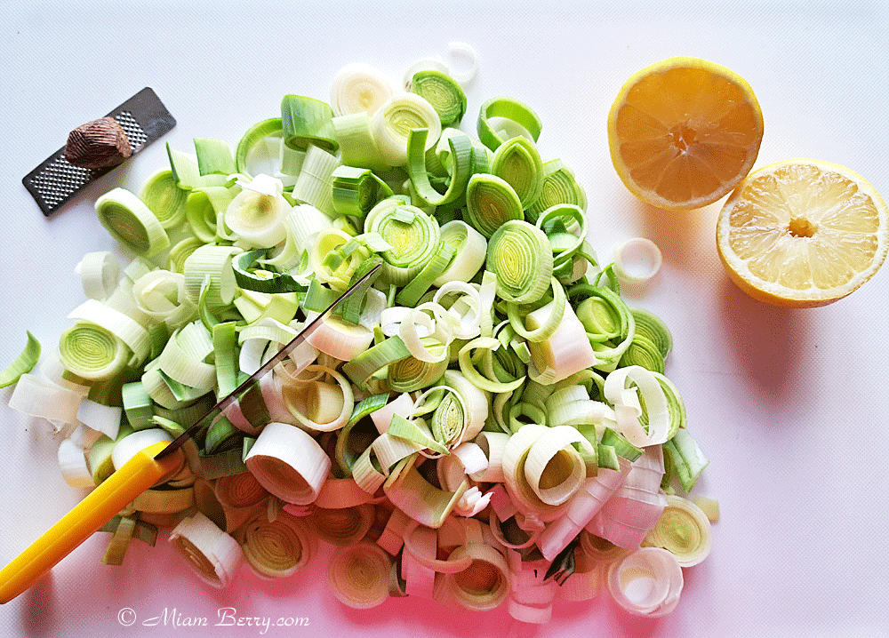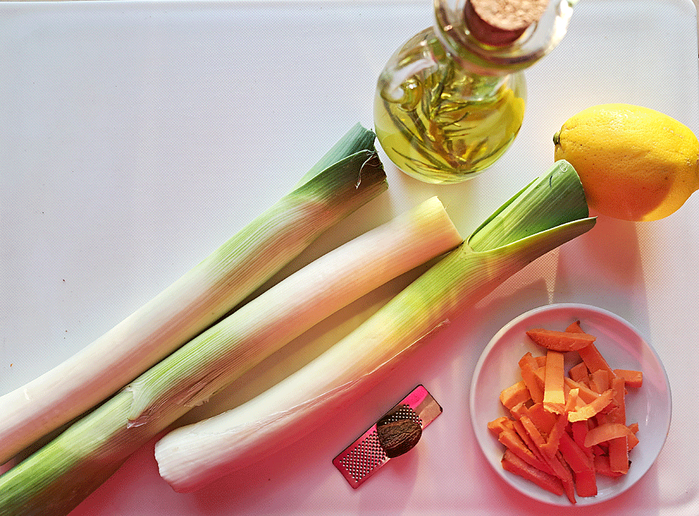 2 à 3 poireaux – 1 patate douce (de taille moyenne) – le jus d’un 1/2 citron bio – 1 petite pincée de noix de muscade râpée – quelques pluches de pimprenelle / ou persil – 1 pincée de sel.