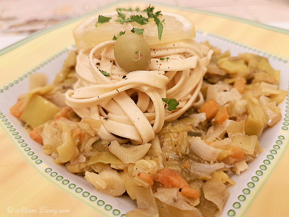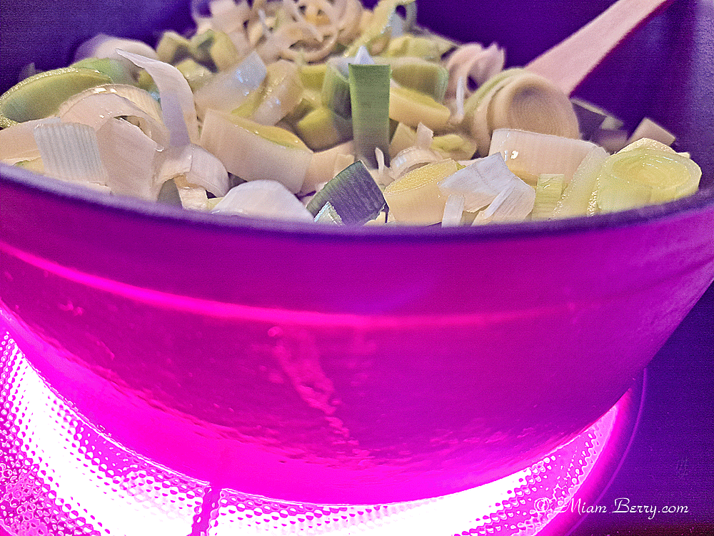 A l’étuvée, c’est-à-dire que poireaux et patate douce ont été cuits dans leur propre jus, tout au plus, le jus d’un demi-citron pour lui apporter une petite saveur supplémentaire. De l’autre moitié, j’ai coupé deux 1/2 rondelles (1 par assiette) pour la décoration finale. La cuisson à l’étuvée se suffit à elle-même : une saine cuisson. Aussi, quel délice de cuire ainsi les légumes frais !