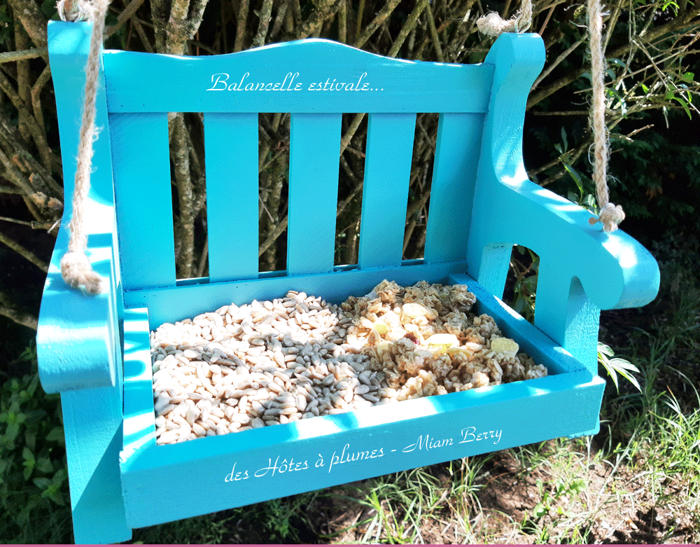 Au printemps 2022, je cède à l’achat de cette mangeoire que je trouve charmante, et j’en fait une balancelle estivale d’où les plus hardis familiers du jardin ne vont pas tarder à venir voir ce qu’il se passe par ici. la famille des mésanges y fait école depuis, et ne manque absolument de rien, quant à l’environnement immédiat.