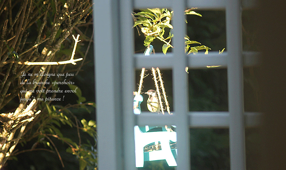 La cuisine ayant vue sur le jardin et le potager, j’aime beaucoup les observer. Ce sont des amies qui ne se laisse guère approcher et au moindre mouvement alentour, elles partent en courant. Observez-les, vous verrez… C’est aussi pour cela que cet oiseau est très souvent à la cime des arbres : en fait, la mésange recherche la tranquillité et se protège de ses proies. Elle n’apprécie nullement de jouer à chats perchés. D’autant plus que sur nos arbres il n’y a pas de « larmier », contrairement aux pigeonniers.