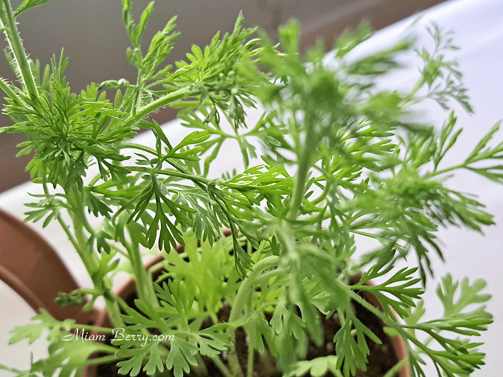 Je trouverais prématuré de décrire dans mon article ses fleurs, alors qu’elle ne montre actuellement que son très joli feuillage vert clair. Tout au plus, je croise les doigts de contempler ladite fleur estivale en 5 pétales, selon son coloris bleu pastellisé.