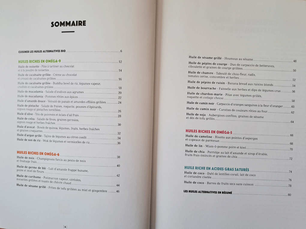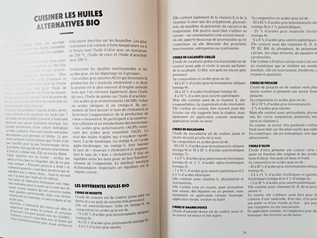 Un ouvrage fort intéressant, au demeurant, se referme sur un tableur qui reprend un résumé de 25 huiles et leurs associations en cuisine.