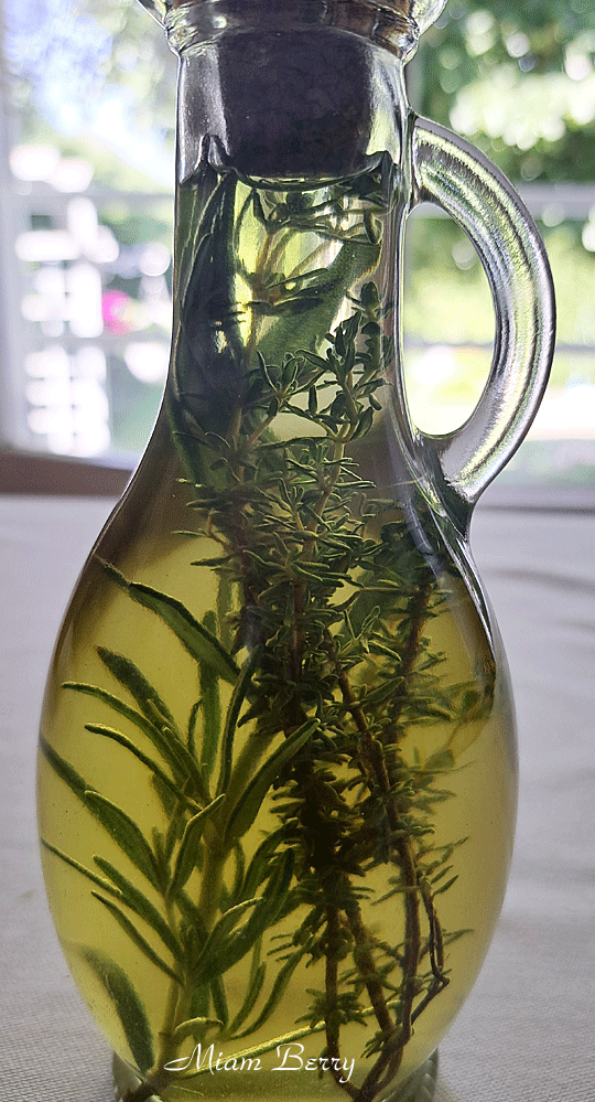 À partir de cette huile d’olive vierge Bio & de première pression à froid, sont tiges de romarin et de thym issues du potager.