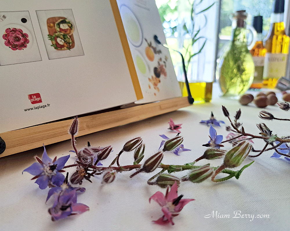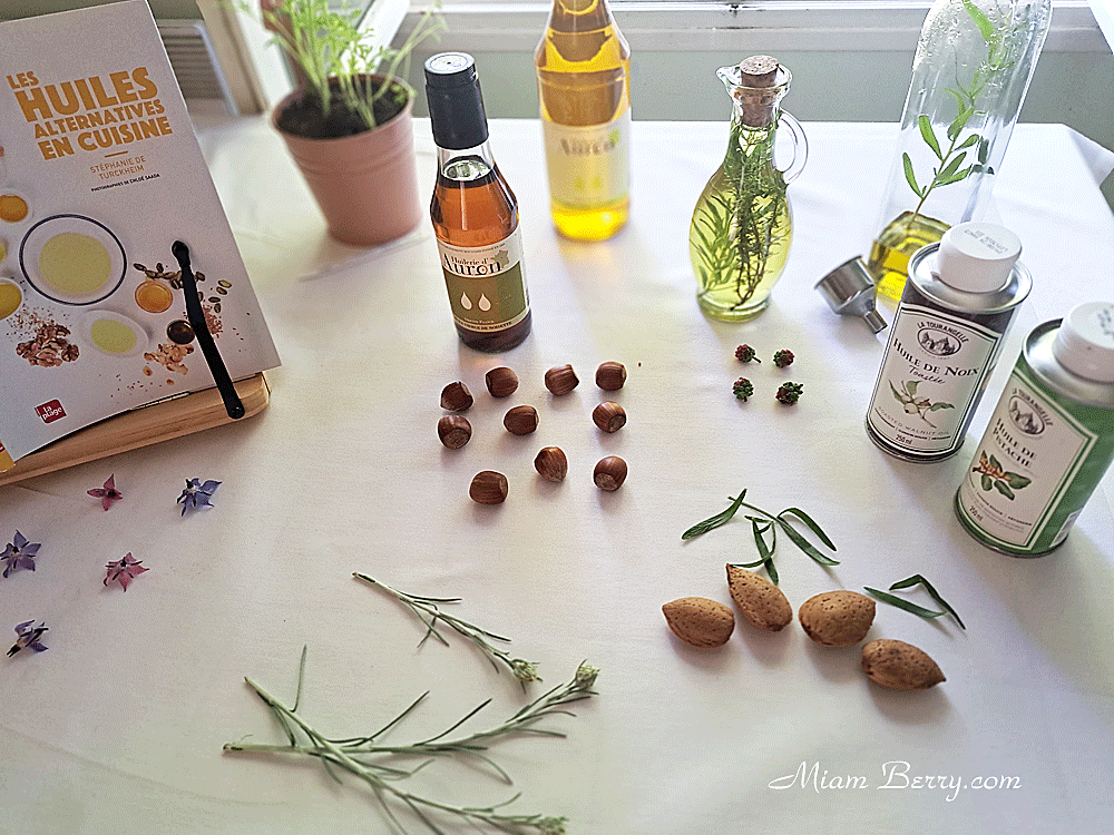 C’est vrai, j’utilise davantage les huiles telles qu’olive, colza, noix et noisette, pistache, estragon, de bourrache ou de nigelle aromatique extraite grâce aux graines (photo : nigelle aromatique Bio pas encore fleurie, placée pour l’occasion à côté des huiles).