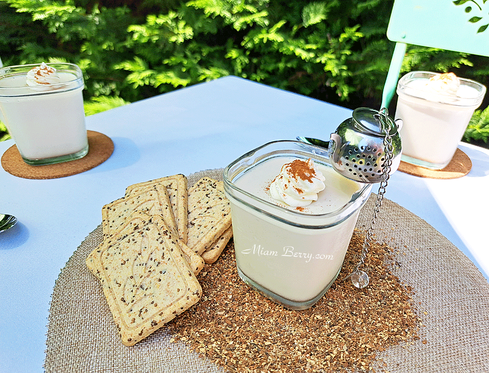 La belle saison revenue, table et chaises au jardin aussi, raison de plus pour apprécier ce dessert au naturel comme il se doit. Au centre de la table, une théière s’est hissée au rebord d’une verrine. Petite mise en scène que je fis à l’augure de gourmets, rappelant ce qui fait le charme de cette exquise infusion d’épices : lesquelles unies pour le meilleur ! Un clin d’œil fait à valeur de 3 c. à s. de crème fouettée, saupoudrée léger de cannelle dans chacune des verrines (facultatif).