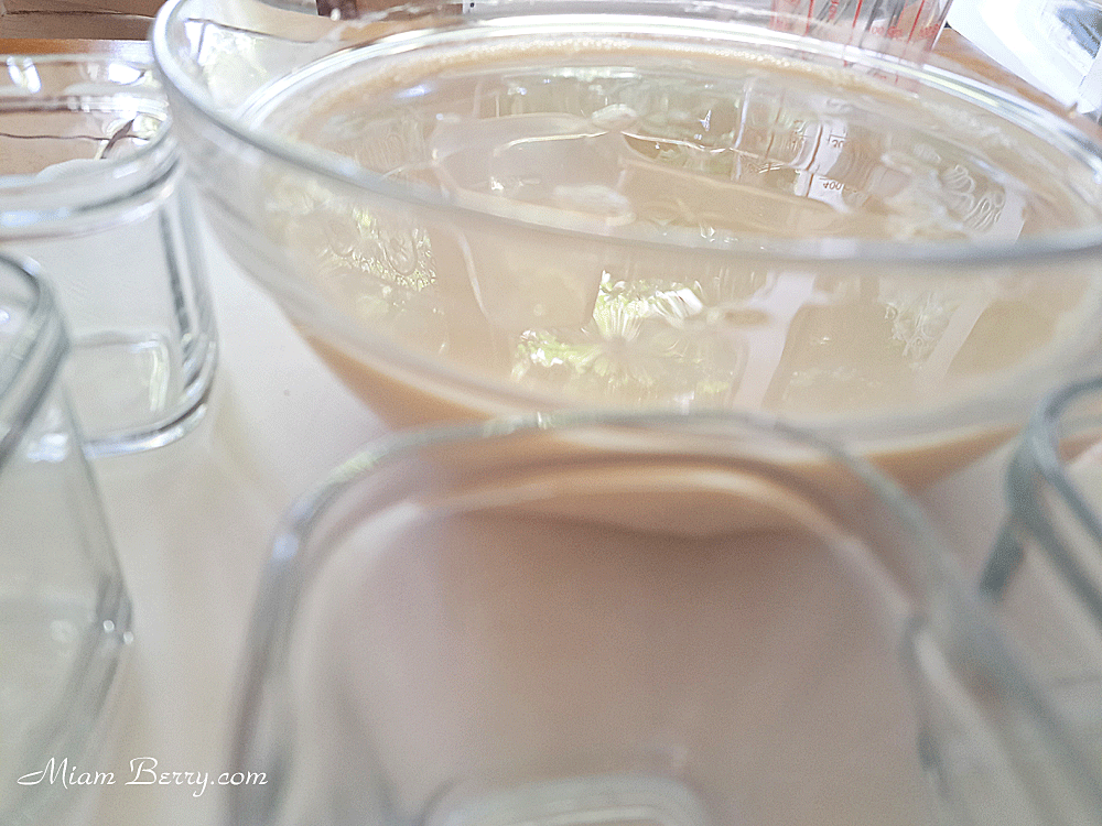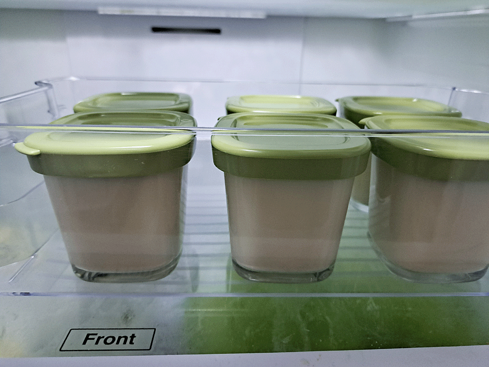 2. Mélangez le lait avec le yaourt, jusqu’à ce que la préparation soi homogène et sans faire trop de bulles, puis verser dans les pots.