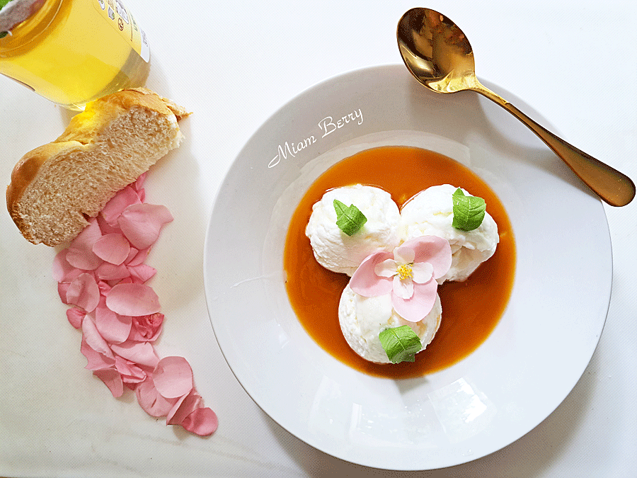 Prélevez le fromage pour former 3 boules avec une cuillère à glace, puis les placer sur le coulis d’abricot. Avec une c. à c. coulez sur celles-ci un fin filet de miel.