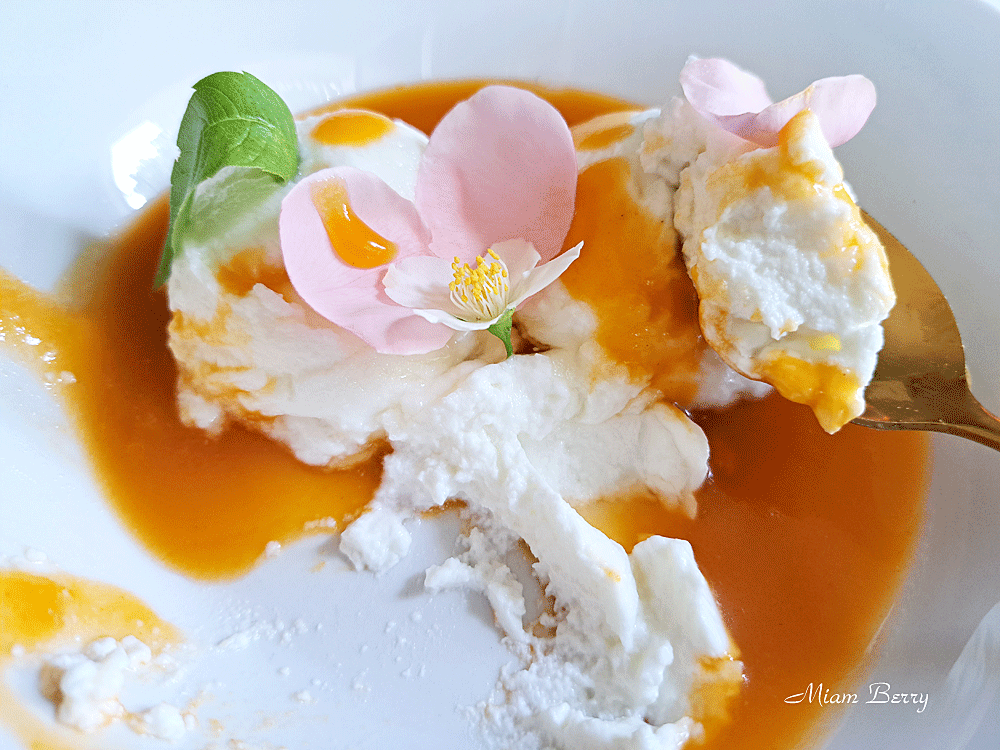 Pour surprendre vos papilles gourmettes, chèvre frais berrichon à la faisselle, abricot en coulis, pétales de rose ancienne Nohéma, miel d’acacia, fleur de seringa et feuilles de verveine citronnelle s’unissent au centre de l’assiette, en un succulent dessert !