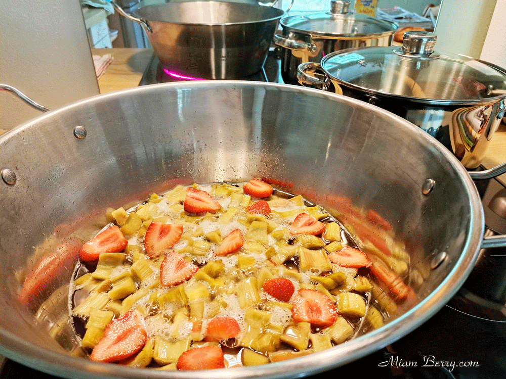 Portez à moyenne ébullition, puis écumez, lorsque le sirop atteint 105 °C, puis ajoutez la rhubarbe et les fraises préalablement nettoyées et lavés à l’eau tiède.
