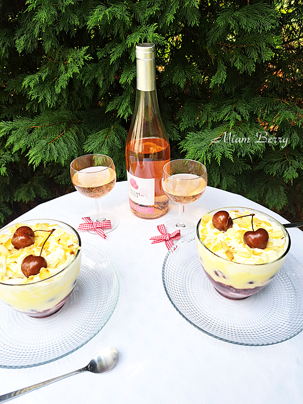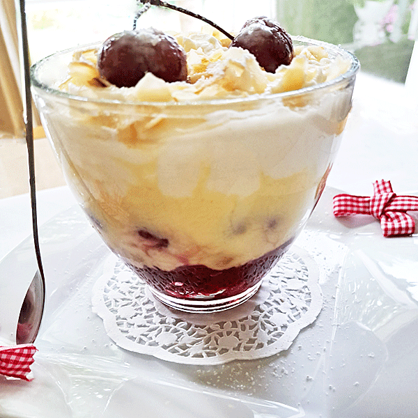 En première quinzaine de juin et à l’instar de belles cerises bien charnues et pur jus, je n’ai pas manqué de donner une suite favorable « trifle », d’un vif plaisir chaque fois renouvelé. Cette fois, en ajoutant à ma préparation du kirsch… Un pur régal !