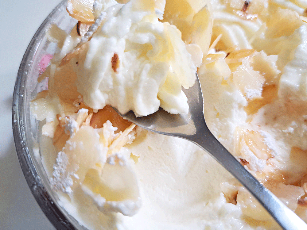 2. Sortir et ajoutez les cerises noires fendues de moitié, puis versez dessus la crème anglaise refroidie. Remettre au réfrigérateur pour 1/2 h environ. Pendant ce temps, montez la crème fouettée : crème fleurette avec mascarpone et ajoutez le sucre glace. Ressortir les coupes, prêtes à recevoir la crème fouettée. Laissez reposer (de 3 à 5 h) au frais, puis juste avant de servir, ajoutez aux trifles quelques amandes torréfiées.