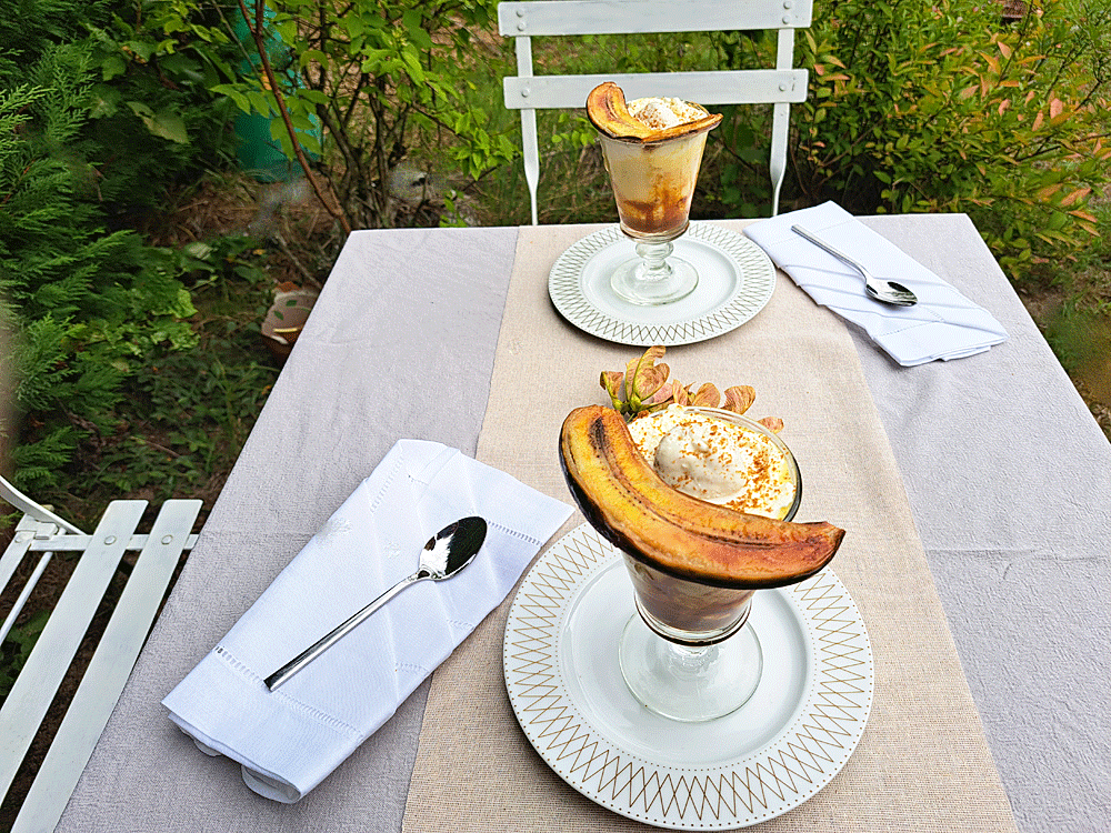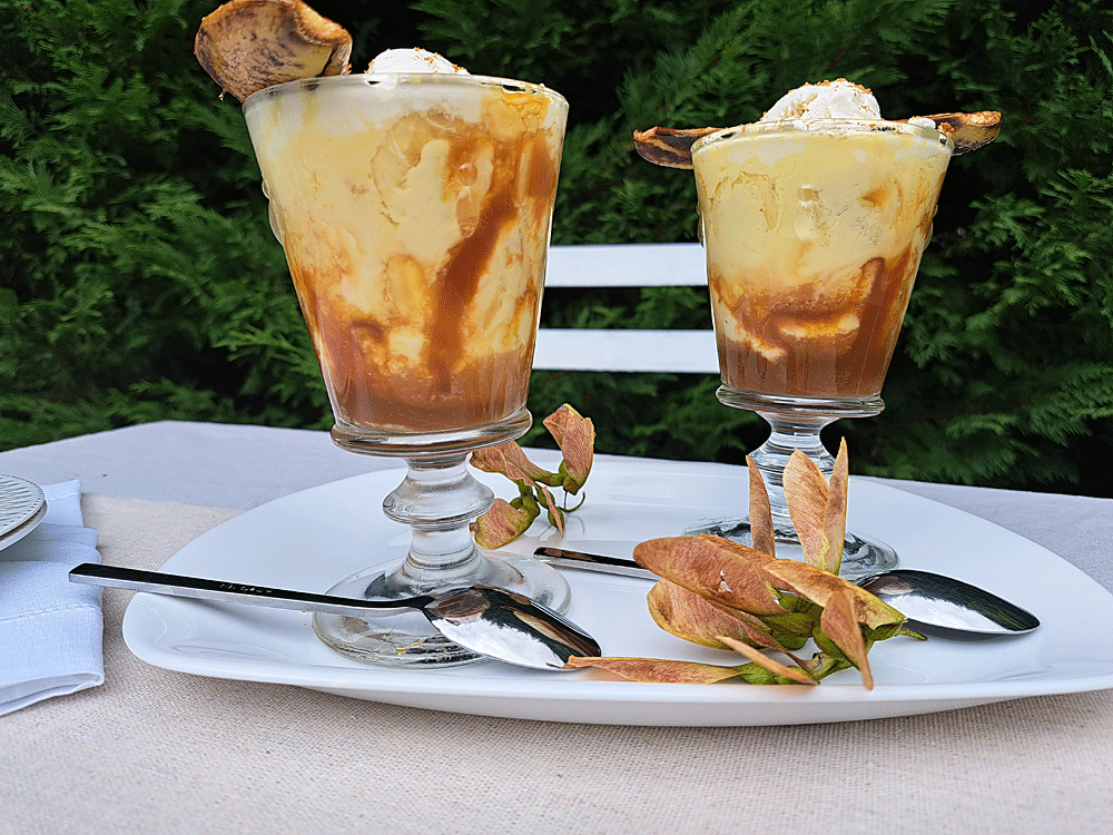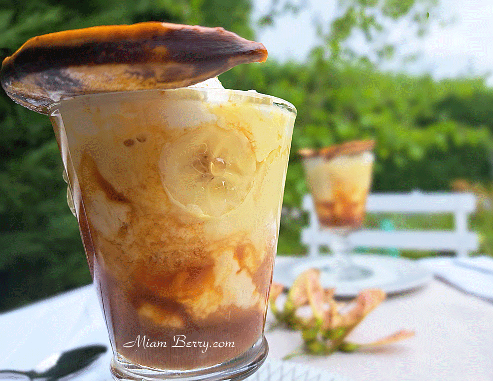 5. Fendre la 3ème banane par la longueur (photo ci-dessus). Mettre l’équivalent d’1 c. à c. de sucre de canne dans une poêle. Lorsque celui-ci est fondu et prend une couleur jaune, mettre les moitiés de bananes à caraméliser (c’est rapide). Placez les moitiés sur une assiette. Sortir les verrines du frigo, puis versez dans chacune 1 c. à soupe de caramel beurre salé. Remettre en attente au frig, le temps de monter la chantilly comme vous avez l’habitude, avec 1 c. à s. de mascarpone et un peu de sucre glace ajoutée à la crème fleurette. Terminez la préparation de chaque coupe par une petite boule de glace, puis déposez sur le rebord 1/2 tranche de banane caramélisée.