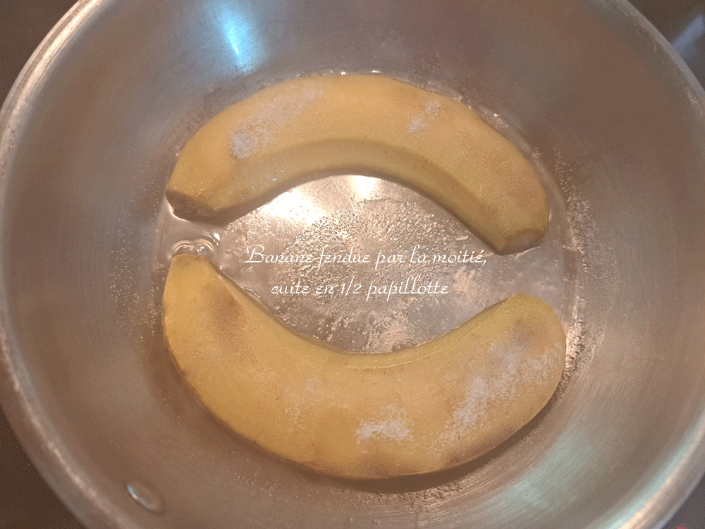 Des bananes Antillaisses bio que je ramenais des coures. Idéales elles sont, pour ce que je pensais présenter : 1/2 banane cuite avec sa peau – lavée et citronnée au préalable, caramélisée avec 1 c. à c. de sucre pure canne déco). Ces délictueuses bananes sont toutefois à consommer rapidement, un peu moins résistantes que le classiques.