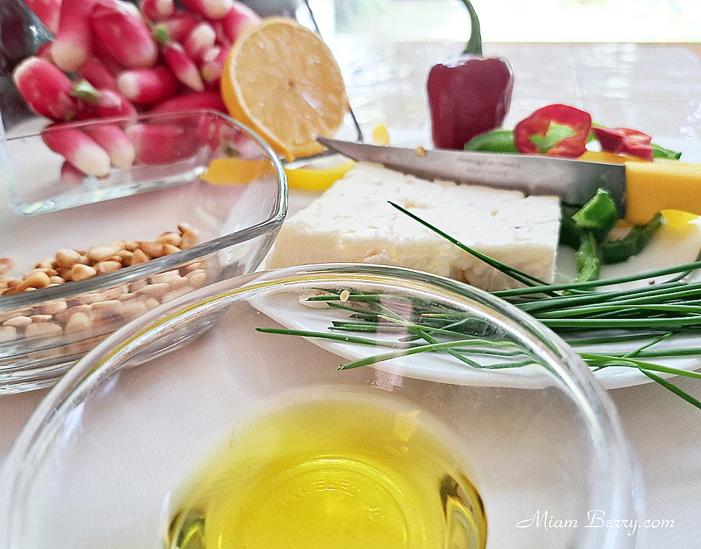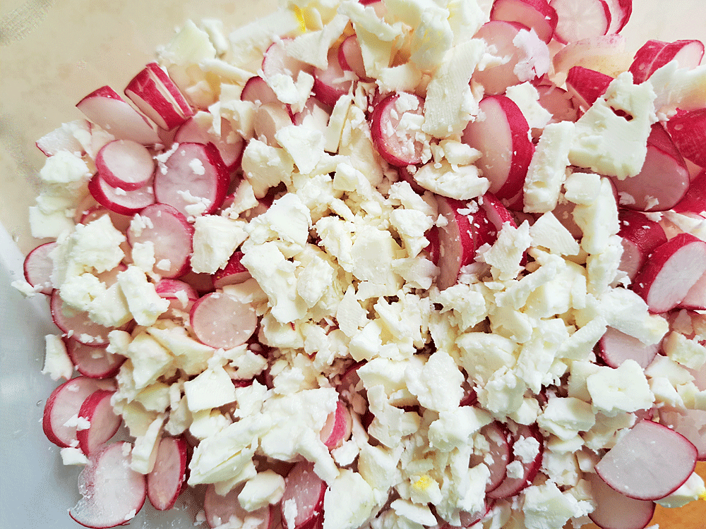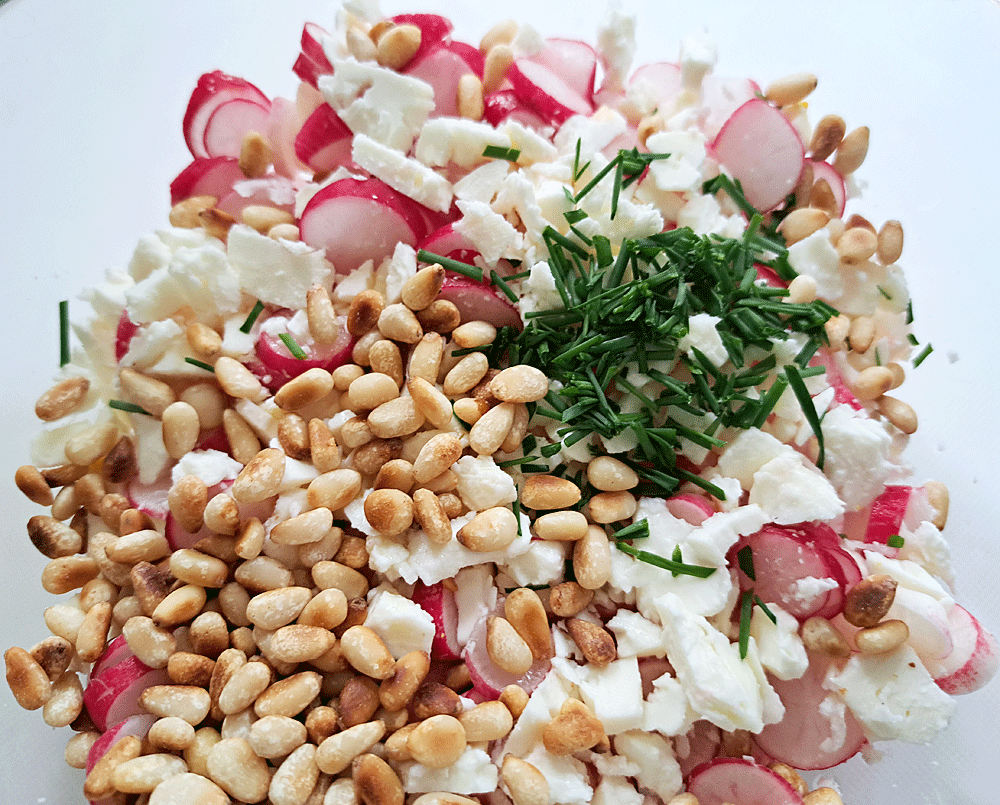 3. Faites griller les pignons dans une poêle à sec. Lavez et émincez les radis. Versez-les dans un saladier, ajoutez la feta émiettée, l’huile d’olive, le jus de citron pressé, la ciboulette ciselée et les pignons.