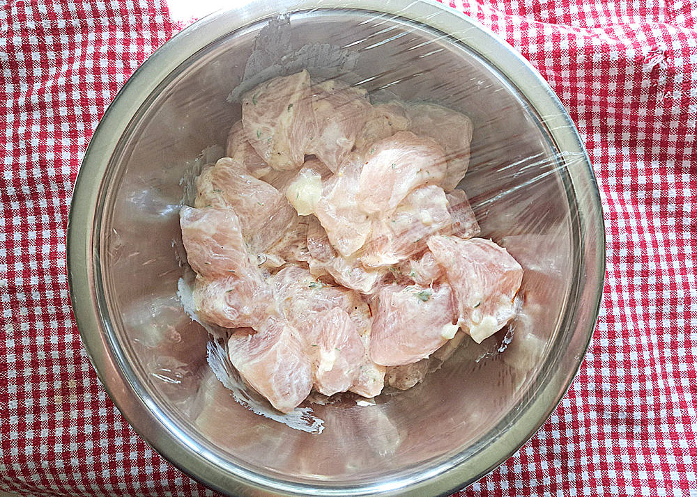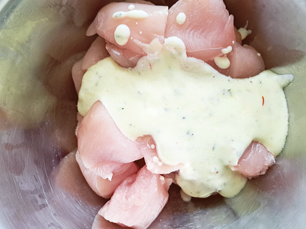 2. Dans un bol, préparez la marinade avec tous les ingrédients précisés. Versez-la sur les morceaux de poulet et mélangez pour bien les enrober.