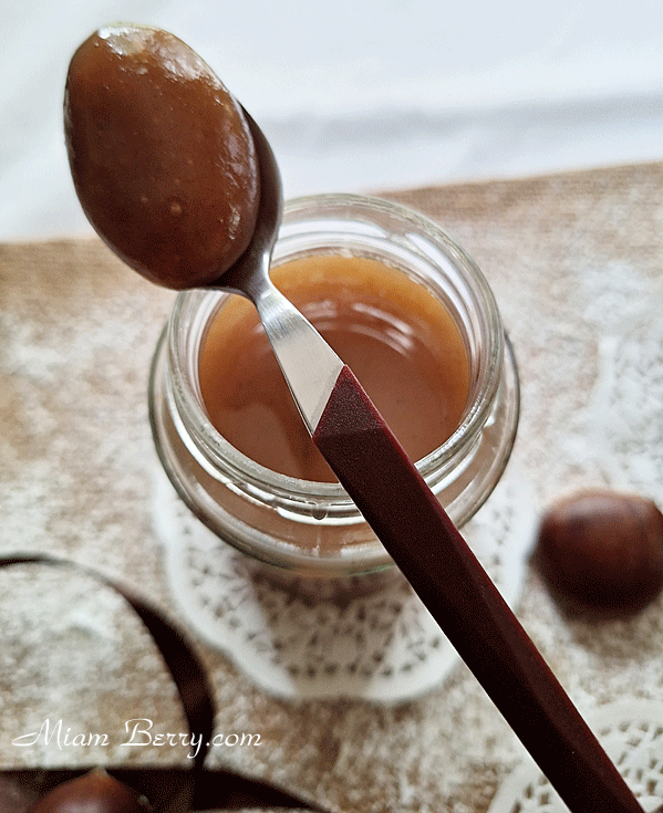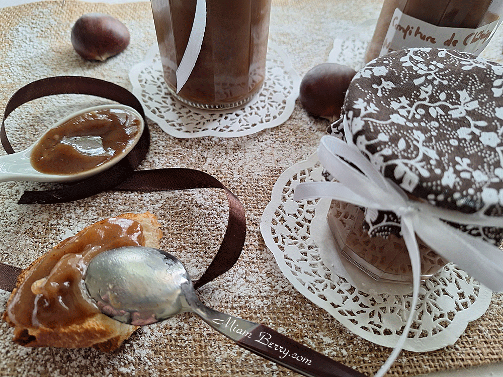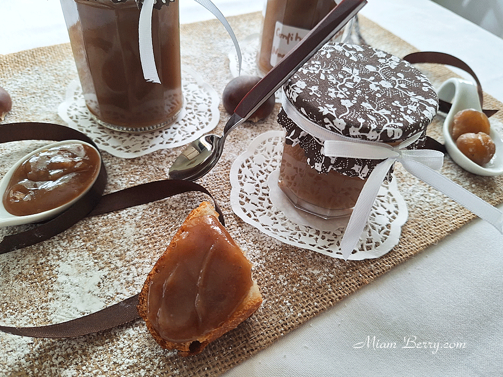 Je retourne à la confiture de châtaignes. Je mentionne « éclats », puisque j’ai volontairement conservé pour chaque pot réalisé, quelques fins morceaux confondus dans une généreuse texture à mi-chemin entre marmelade et confiture.
