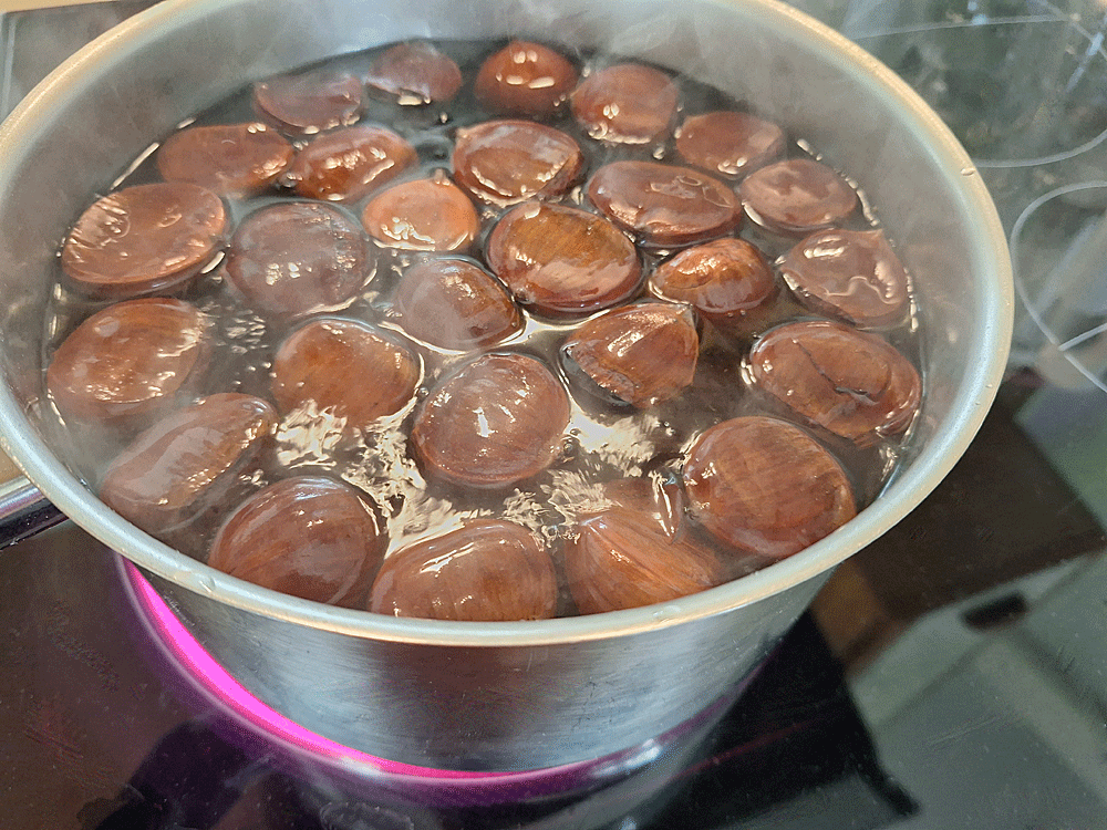 1. Les châtaignes sont incisées avec la lame du couteau avant de les mettre dans une casserole ou une cocotte remplie d’eau portée à ébullition 8 à 10 mn.