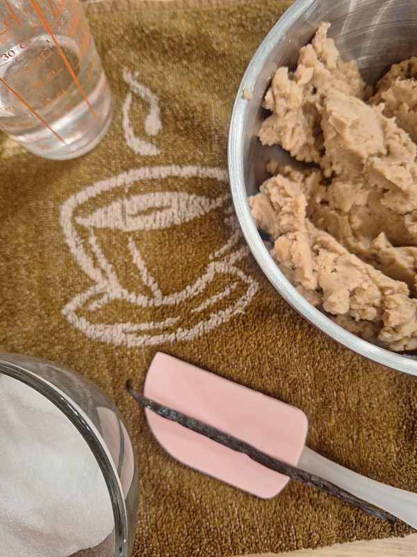 3. Les châtaignes sont ainsi réduites en purée, laquelle préalablement mise dans une casserole avec 15 cl d’eau, les 700 g de sucre (oui, je réduis pour 1 kg de fruits voir moins chaque fois), je récupère à la lame du couteau les précieuses graines d’une vanille fendue en 2.