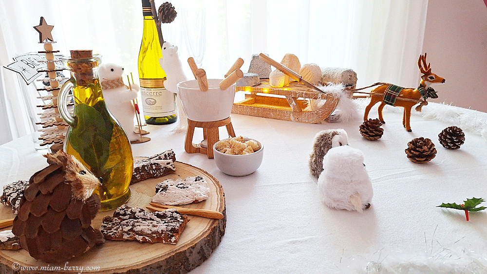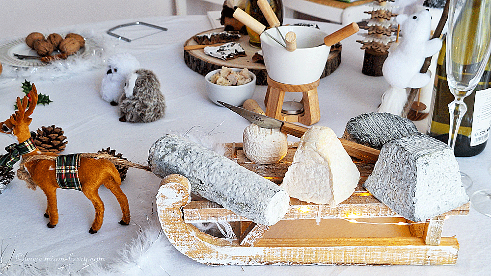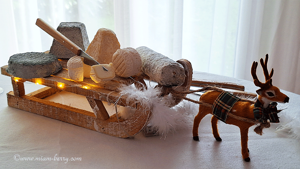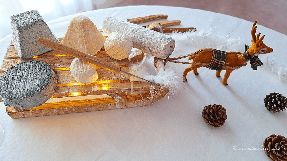 En après-midi, après avoir flâné toute la matinée sur le marché, je suis tombée nez à nez avec cette luge sur l’un des rayonnages d’un magasin. Après l’avoir observée dans ses moindres détails – les bois bien fusionnés entre eux, aucun de travers, et le raccordement leds fonctionnant –, je ramenais ceci à la maison. En fait, cette petite luge n’est pas sans me rappeler les joies d’enfance à cette période. Dressant soigneusement la table pour le repas qui allait suivre, je la disposais en lui proposant 5 AOP d’excellente compagnie. Un pilier fromager au lait cru, magicien du patrimoine gastronomique.