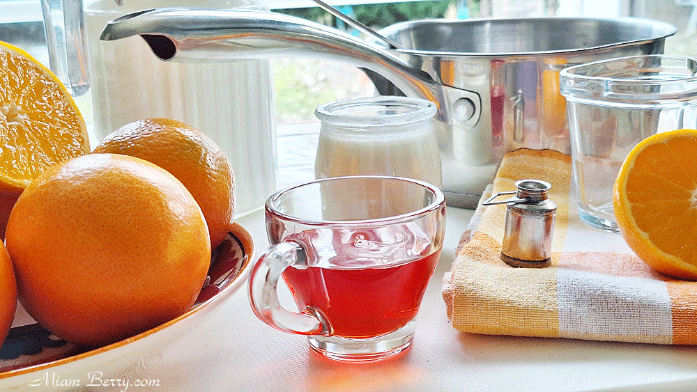 3. Lorsque ce mélange est devenu plus ou moins translucide et s’est épaissit, je fis le test de l’assiette avec des gouttes de sirop, puis j’ai retiré la casserole du feu. J’ai retiré les peaux du citron.